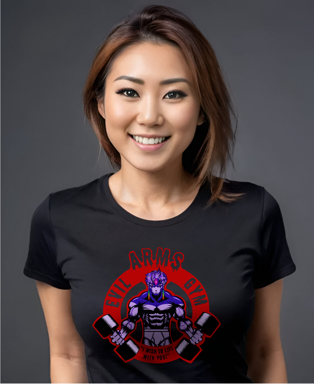 Step into the supernatural power zone with the Evil Arms Gym t-shirt — inspired by The Evil Eye from Dandadan. This bold design features a jacked, interdimensional anti-hero with glowing eyes, massive arms, and dual dumbbells, surrounded by blood-red gym insignia and the spine-chilling quote:
